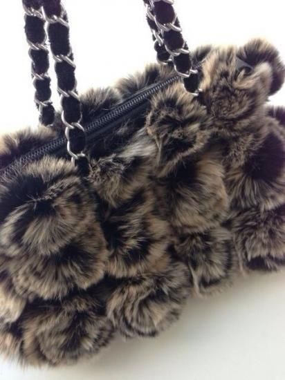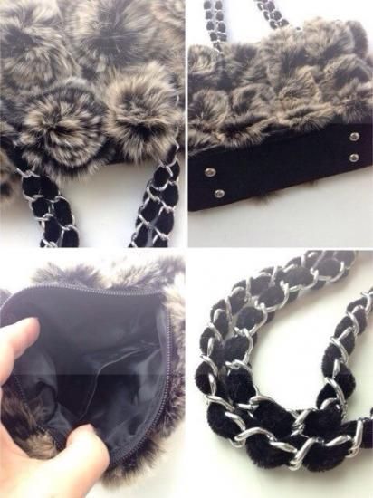 チェーン部分にビロードタッチのブラックリボンが編み込まれたファスナー付きレッキス毛皮バッグ